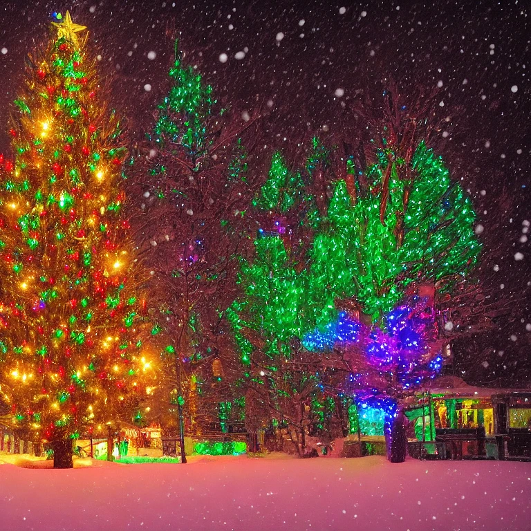 Huge colorful Christmas Tree with tousands lights in a town with lot of snow in the style of Gregory Crewdson, cinematic, spooky, night, foggy,