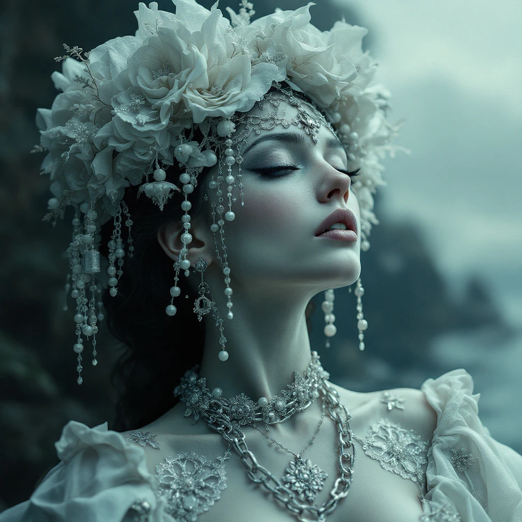 "Prisoner of Grace" – a surreal and poetic portrait of a woman in chains, delicate yet unbroken, symbolizing that locks may hold the body but never the spirit. She is haunted by the memory of a lost paradise, torn between dream and fading youth. Ethereal atmosphere, baroque and surrealist influence, intricate costume design with ornate details, soft yet dramatic lighting. Inspired by Sacha Goldberger, Cindy Sherman, David LaChapelle, and Gabriel Pacheco. Cinematic, painterly, highly detailed, emotional, masterpiece.