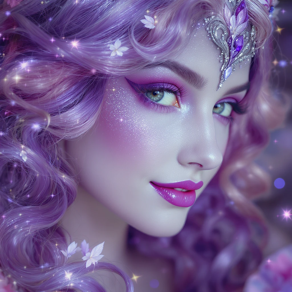 A whimsical close-up portrait of a woman's face with shimmering violet and silver swirls adorning her hair, set against a dreamlike, ethereal background. The style is inspired by Art Nouveau, with intricate, flowing patterns and luminous, vibrant colors. The lighting is soft and magical, highlighting the delicate details and creating a sense of enchantment. The woman's expression is serene and captivating, with gentle features and a soft, inviting smile. The overall composition is balanced and harmonious, focusing on elegance, mystery, and the ethereal beauty of the subject.
