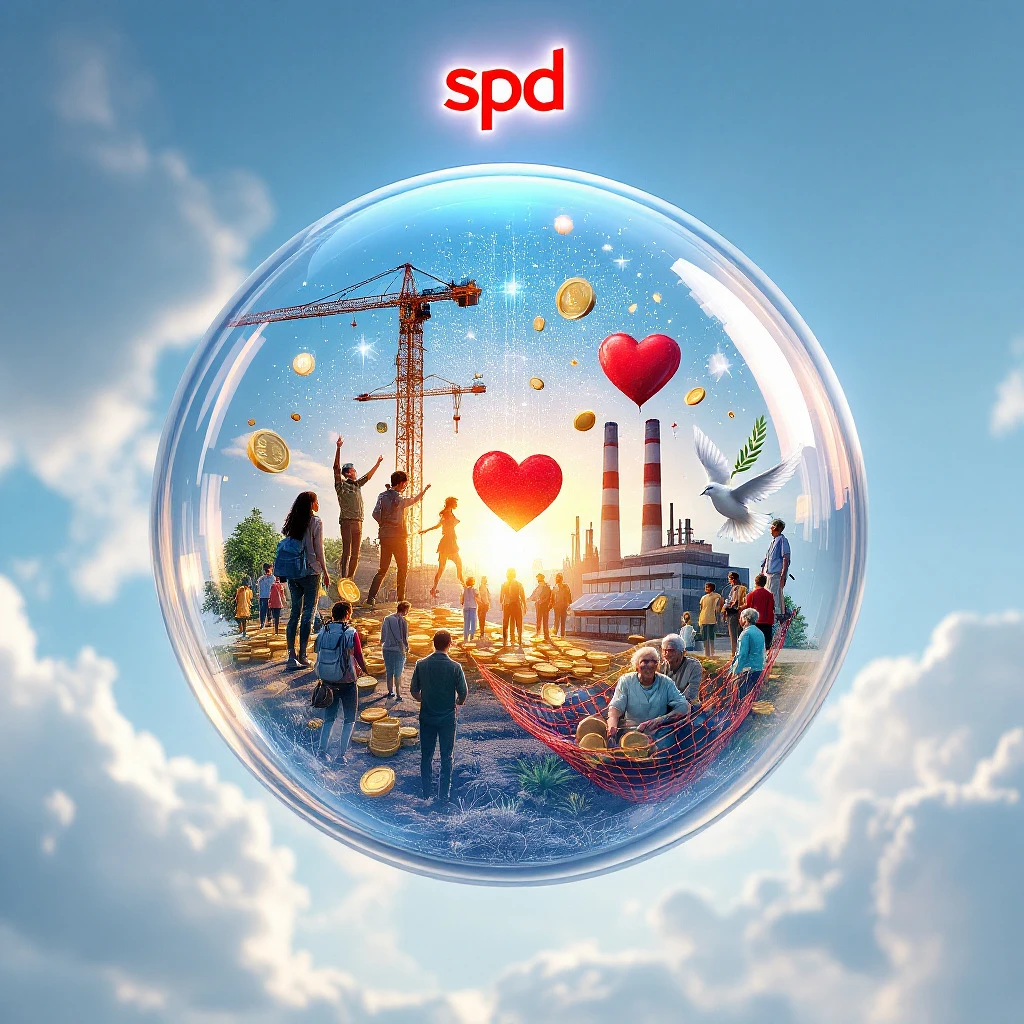 A luminous glass sphere floating in front of a serene blue sky with soft, white cumulus clouds. Inside the sphere, a dynamic composition shows: a modern bridge under construction merging into a digital network, representing infrastructure and digitalization; euro coins raining down on a group of diverse people representing social justice; a modern factory with solar panels symbolizing sustainable economic growth; a red heart-shaped safety net catching elderly people, representing social security and pensions; and a dove carrying an olive branch for peace and diplomacy. The elements flow seamlessly into each other within the sphere, creating a harmonious whole. A holographic 'SPD' logo in classic red hovers above the sphere, casting a subtle glow. The entire scene is rendered in photorealistic detail with soft, natural lighting. The sphere reflects and refracts light, creating subtle rainbow effects. 8k, hyperrealistic, cinematic lighting, octane render.