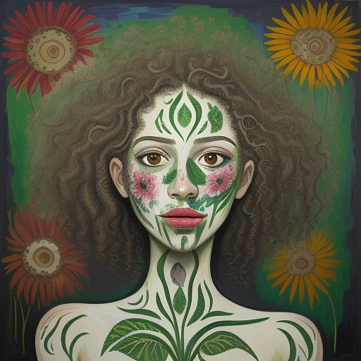 expressionism painting of woman face, flower printed skin, flower patterns on face, green stem patterns, flowers coming out of mouth, thick texture, pallet knife texture, wild curly hair, surrealism, Pablo Picasso