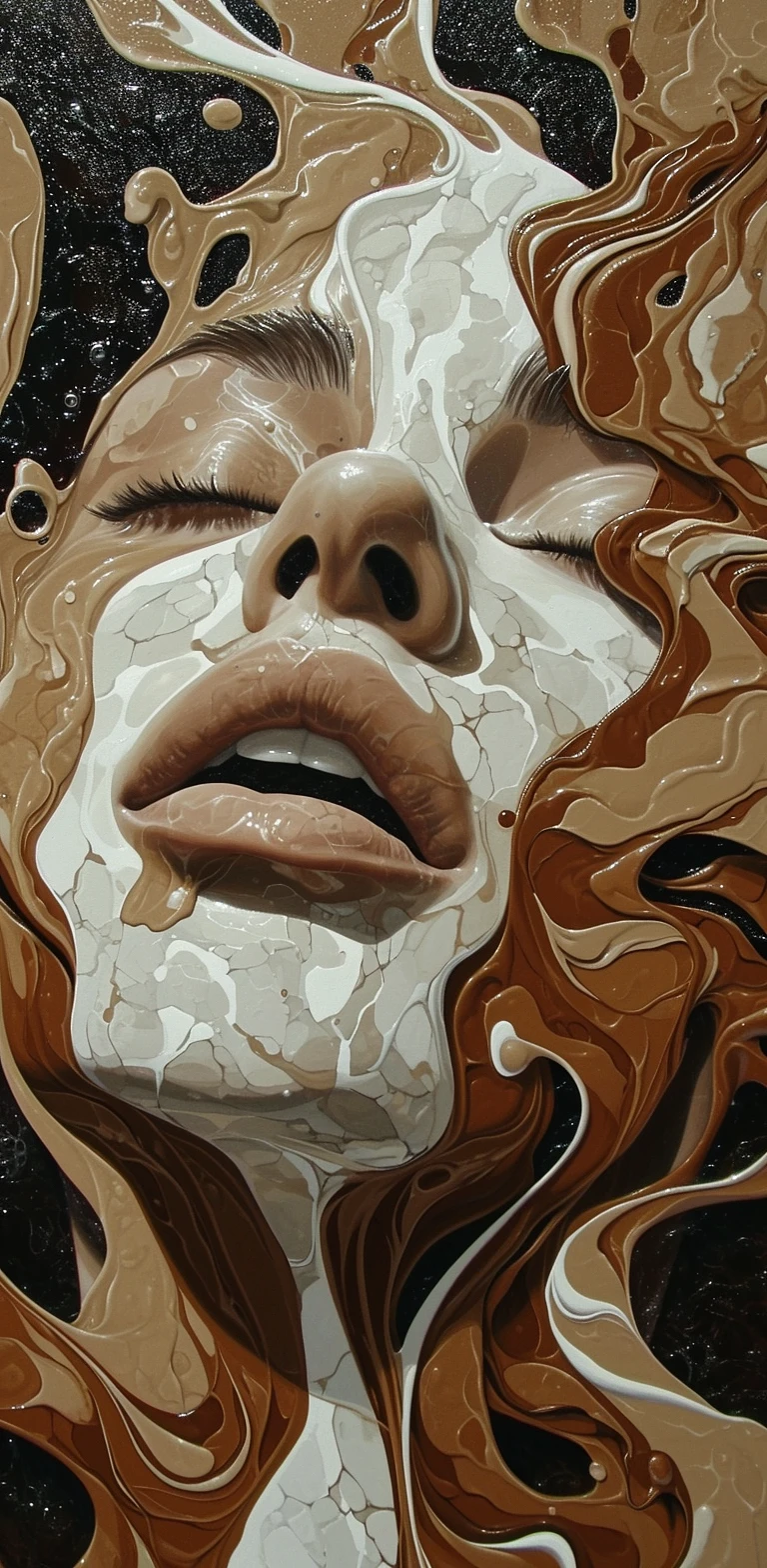 art deco coffee art, in the style of expressive facial animation, afrofuturism, paint dripping technique, hyper-realistic water, realistic perspective, digital art techniques, caravaggism --ar 63:128 --stylize 750 --v 6