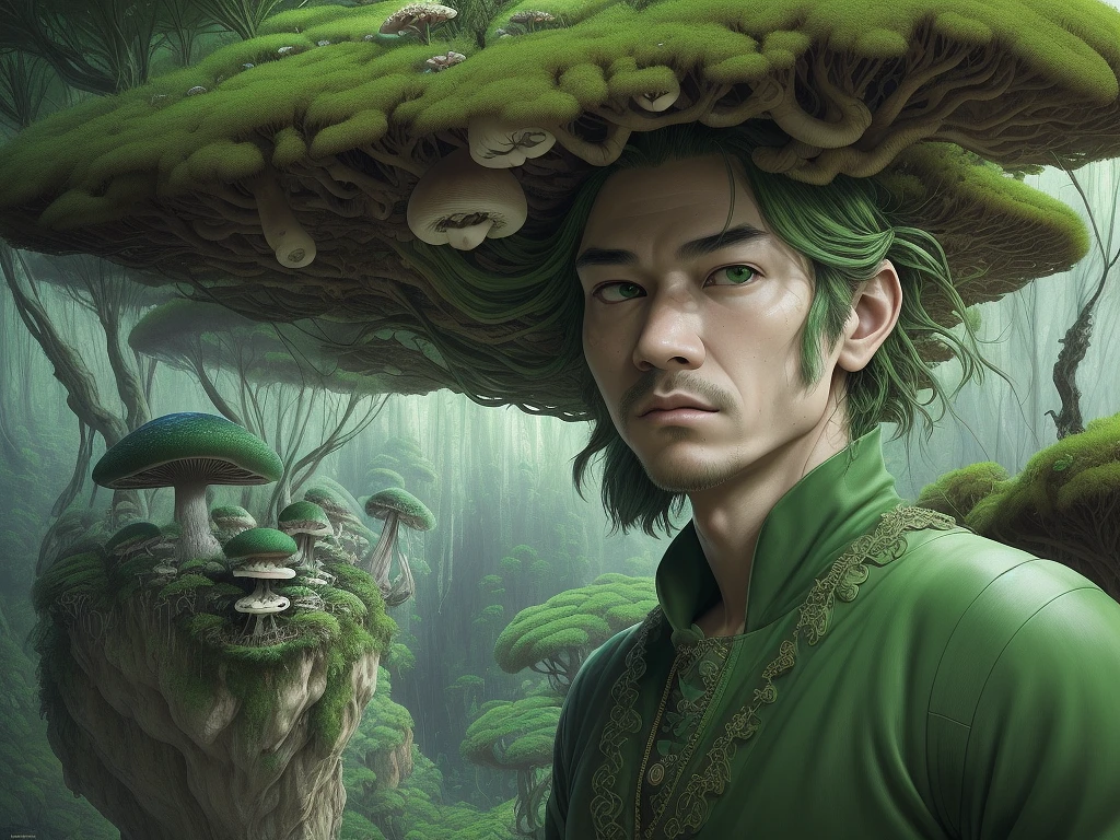(far view) (man) human like mushroom, intricate, realistic face, detailed portrait, detailed face, green outfit, insanely detailed, vivid color, trending on artstation, 4k, hyper realistic, focused, extreme details, cinematic, masterpiece, concept art by Katsuhiro Otomo and real studio ghibli, amidst the lost valley, rock arcs, lush vegetation, exotic forrest and plants, fly agaric mushrooms, landscape, alex ross, eddie mendoza, raphael lacoste, sebastian ludke, concept art, matte painting, highly detailed, rule of thirds, dynamic lighting, cinematic, detailed, magnificiant landscape, denoised, centerd