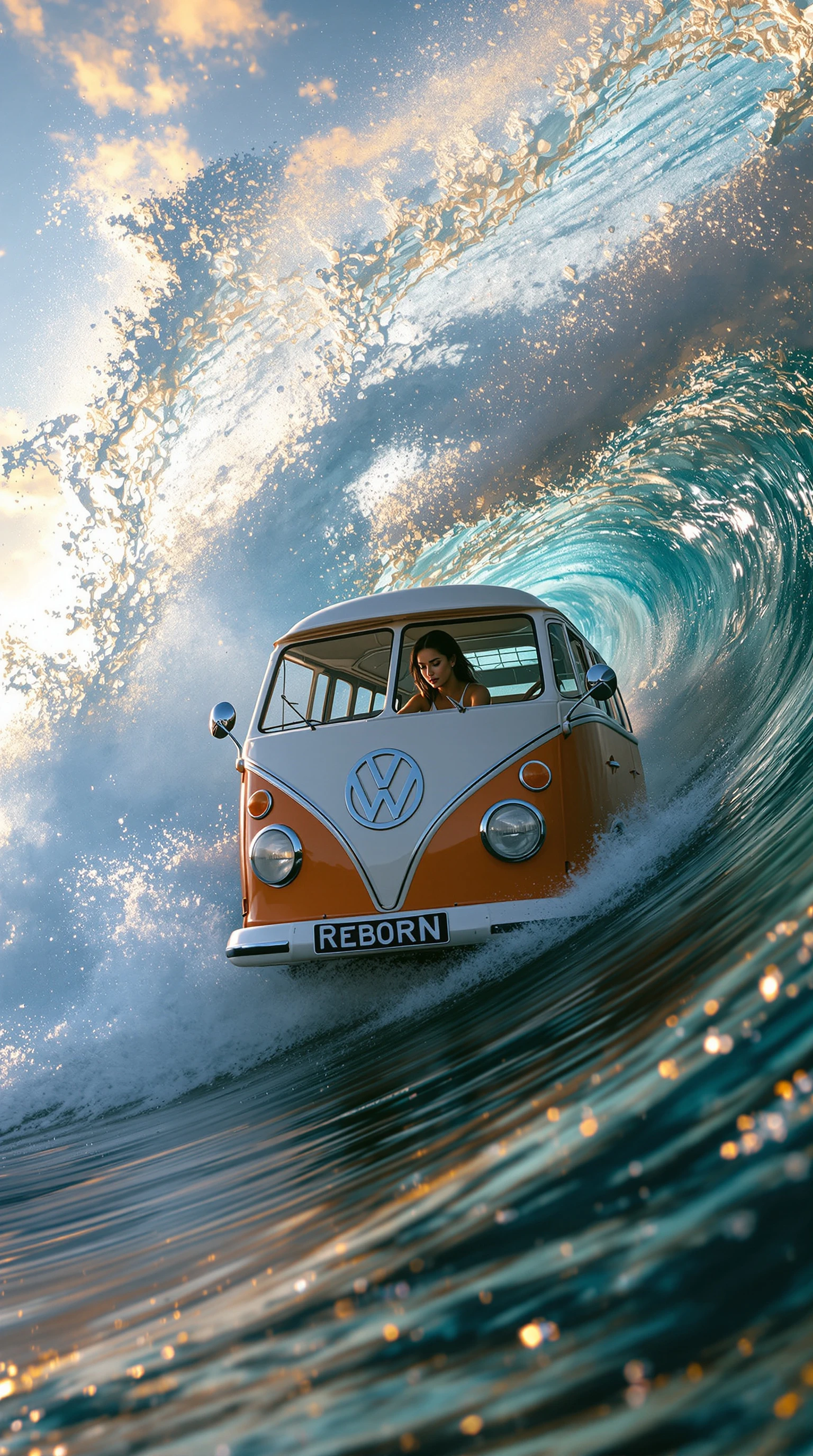 ULTRA HD 4k high realistic fashion image, photo full body shot of a young gorgeous Brazilian woman with a thin athletic physique in a white bikini, surfing down a monster breaking wave, backlit by the sun with a classic vw bus surfing next to her, with the word REBORN written in block letters on the license plate. . . Golden filtering light at sunset, ethereal lighting casting shadows down the face of the wave with rays of light streaming towards the viewer