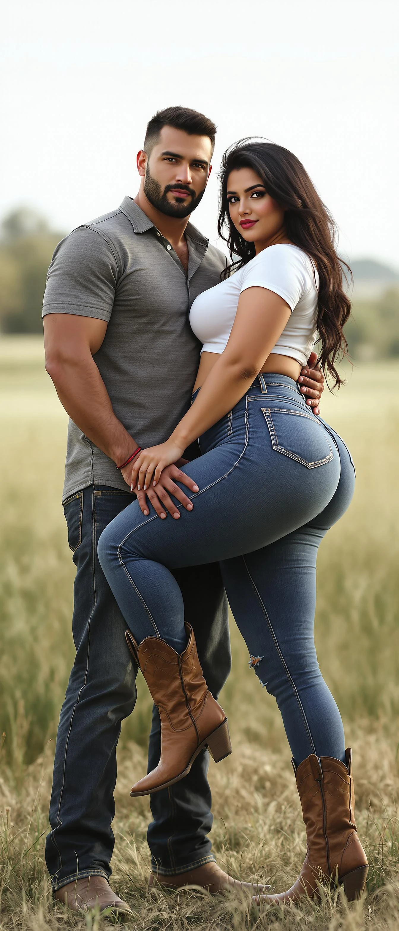 A naughty couple, husband and wife, husband is athletic fit smart handsome wearing straight fit jean's with cowboy boots, wife is a Indian plus size woman with enormous big round juicy ass size 50 butt with a breast size 44 FF and flat stomach, she is wearing a white crop top and jeans with cowboy boots , husband is standing and has picked her up from the ass and her legs are around his waist, her back is to the camera over, both are looking at the camera