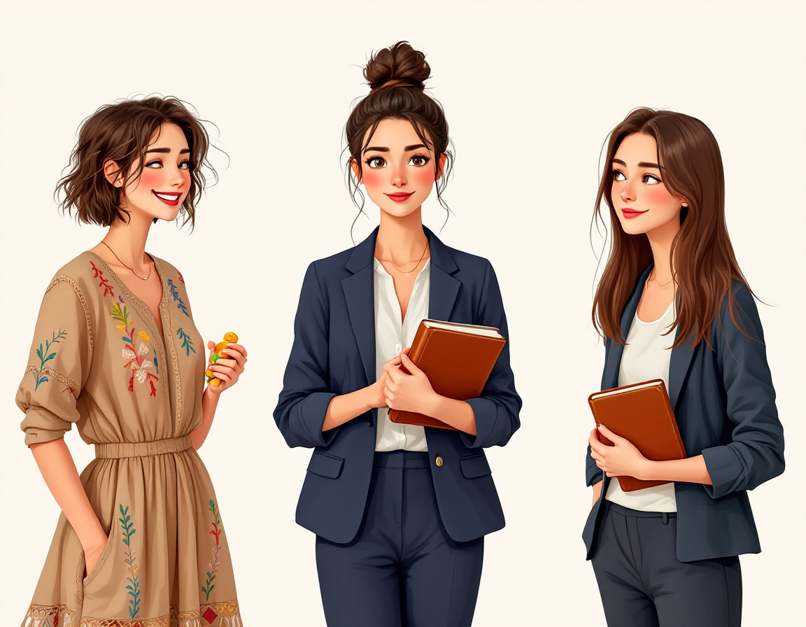 **Mother 2 (Center):** A mature woman in her 40s, with long, straight, dark brown hair pulled back in a sophisticated bun. She's dressed in a classic, tailored navy blazer over a crisp white blouse and dark trousers. Her expression is thoughtful and composed, reflecting a grounded, nurturing style. She carries a leather-bound book in one hand, and a small, well-maintained potted plant in the other. She looks concerned yet confident, suggesting a structured yet empathetic approach to parenting, prioritizing education and personal growth. Her posture is upright and poised.