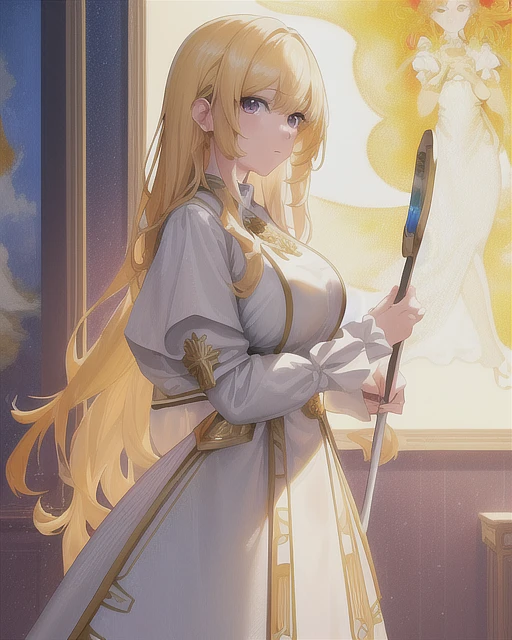A beautiful creative girl doing chores wearing white and golden. The girl has realistic attributes like a natural hair color and mansion. The painting is anime, professionally color graded, 8k HDR, vivid, bright, anime faces, hyper resolution, depth of field, and created by Artgerm, Greg Rutowski, and Alphonse Mucha with volumetric lighting. The painting has very bright colors and uses anime faces that are not distorted.