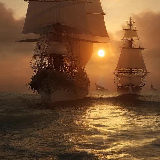 Photo of a ultra realistic sailing ship, dramatic light, pale sunrise, cinematic lighting, battered, low angle, trending on artstation, 4k, hyper realistic, focused, extreme details, unreal engine 5, cinematic, masterpiece, art by studio ghibli, intricate artwork by john william turner