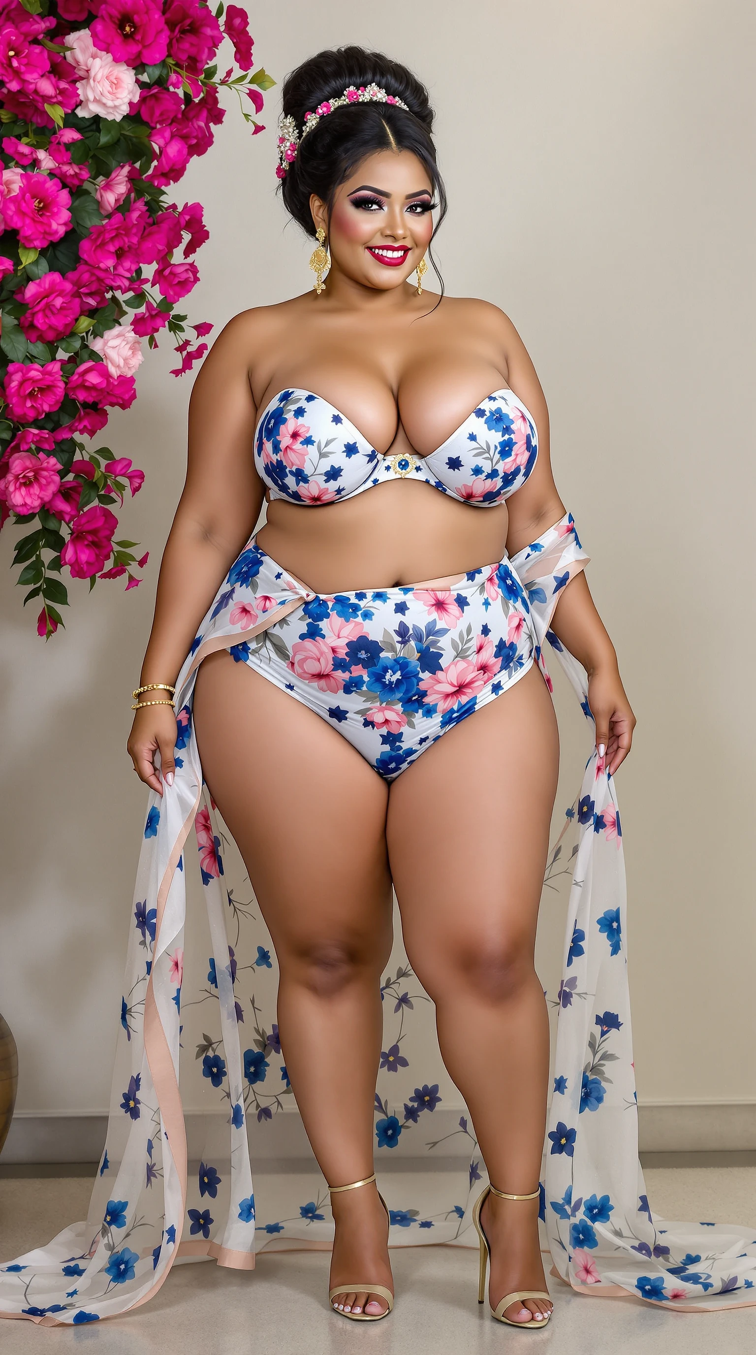 a full front view large puffy boobs ass looking with beautiful black eyes plus size legs with high heels matched color cleavage realistic looking Sexy Indian plus size sexy white Indian woman with sexy beautiful skin color with smiley face a Indian hot and sexy standing on her heart shaped ass butt with blue and pink magenta flowers on her body boobs and legs transparent white and navy blue light pink very thin transparent scarf on boobs and hip see through bra and tiny while panty , capture the delicate contours of her face and the intricate details of her classic hair style black vibrant colors to capture the intensity of the flowers, her hairs styles Gorgeous Cupcake Hued Bun-Style Bridal Hairstyle, she is laughing out loud sexy, she is looking at her back with smiles see through side hip view