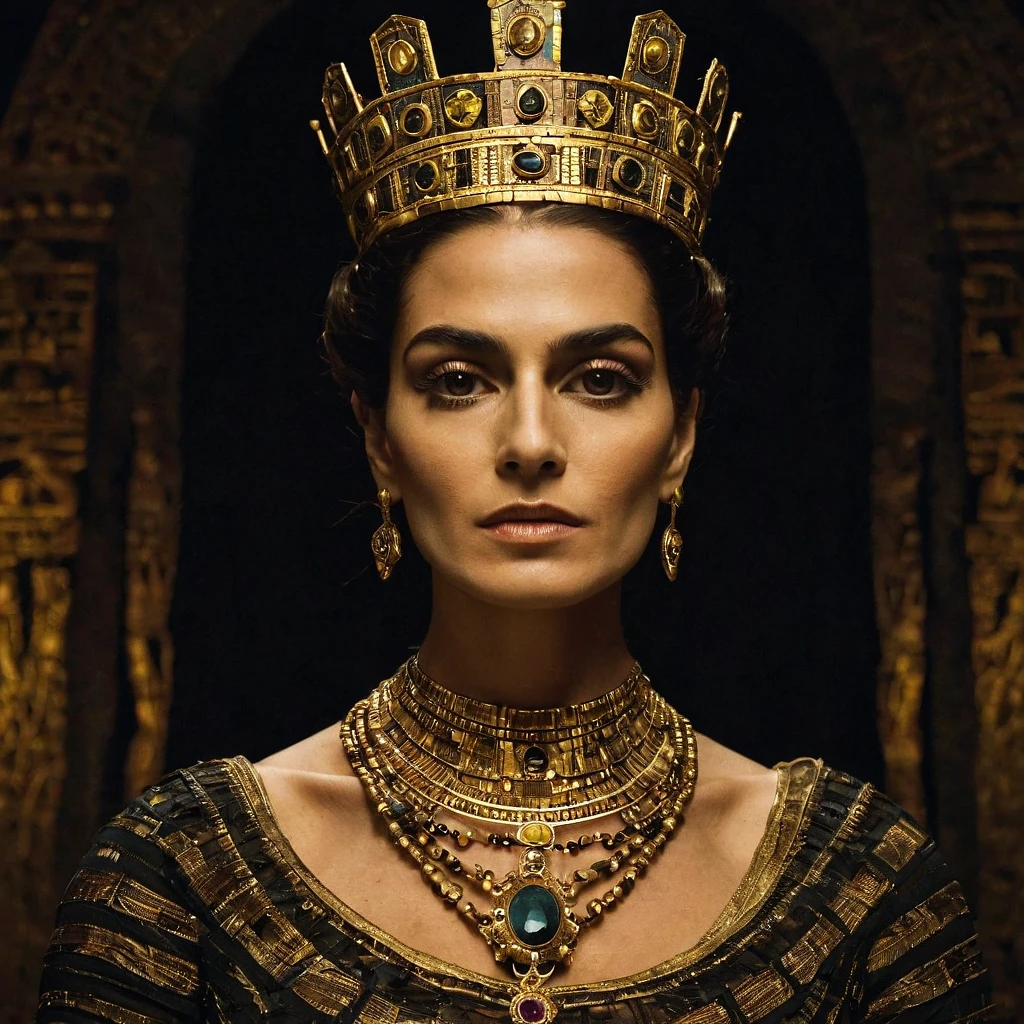 The image features a dead old queen in full attributes, depicted as a mummy. She is wearing a crown and a necklace, with a gold crown on her head and a gold necklace around her neck. The mummy's face is skeletal, and she appears to be wearing a gold and black dress. The scene is set in a dark environment, with a black background and a few lights illuminating the mummy. The overall atmosphere of the image is eerie and mysterious, as it captures the essence of a long-deceased queen preserved in her tomb. (controlnet_mode:canny juggernautXL_v5, sdxl-1.0.0.9. safetensors, SeargeSDXL4.2-Llama2 prompt) , in style of a well-known photographer. Highly detailed. 12K.