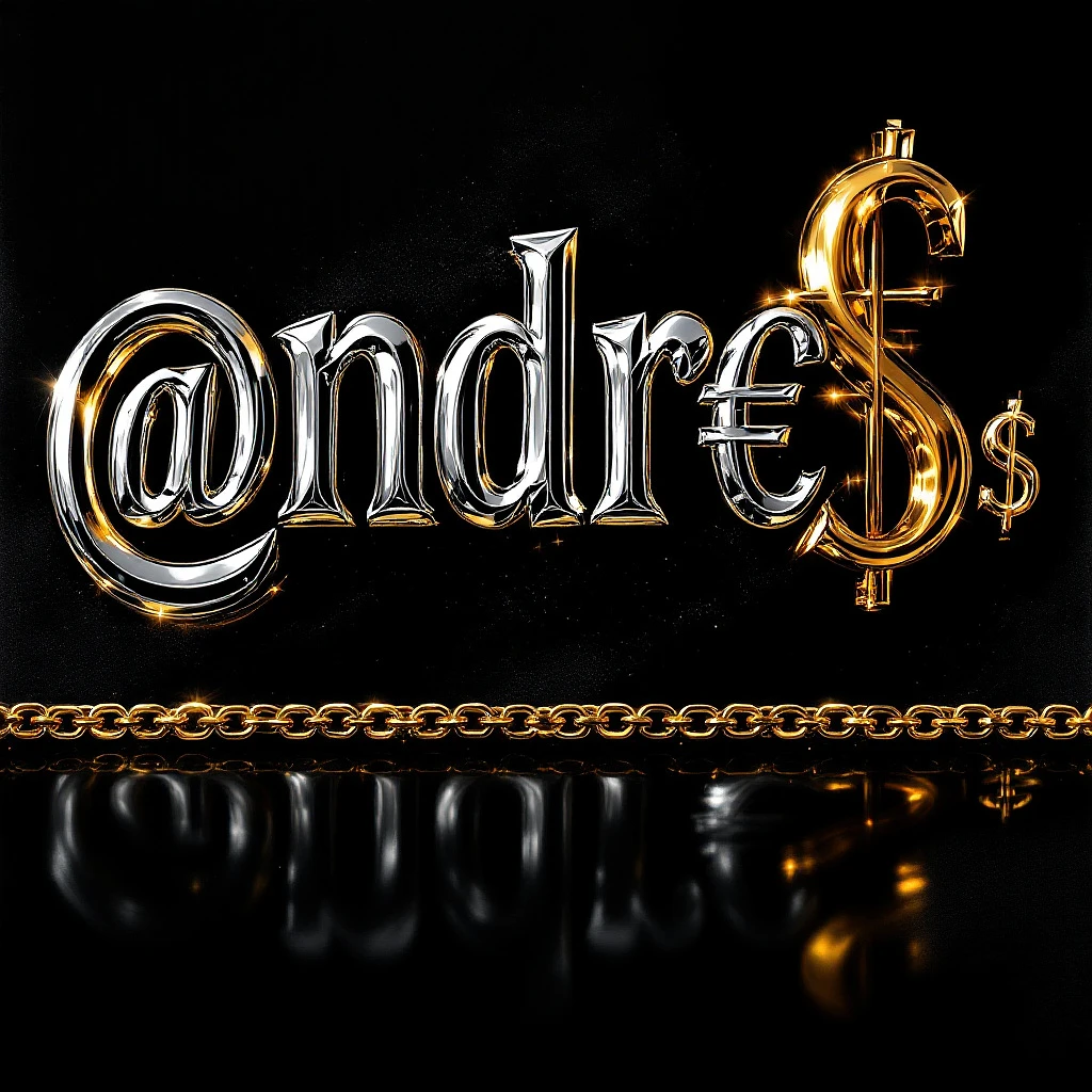 A hyperrealistic oil painting of the gleaming silver characters "@ndr€@" rendered in a metallic chrome finish against a sleek, polished black background with subtle reflections. Beside these characters appears a striking golden dollar sign "$" in luxurious gold leaf, creating the stage name "@ndr€@$". Beneath this name runs an opulent golden chain serving as an underline, with individual links catching the light and casting delicate shadows. The painting features meticulous attention to the play of light on metal surfaces, with highlights accentuating the dimensional quality of each character. The composition evokes the aesthetic of high-end jewelry and luxury branding, with photorealistic detail in the metallic textures and reflective properties.