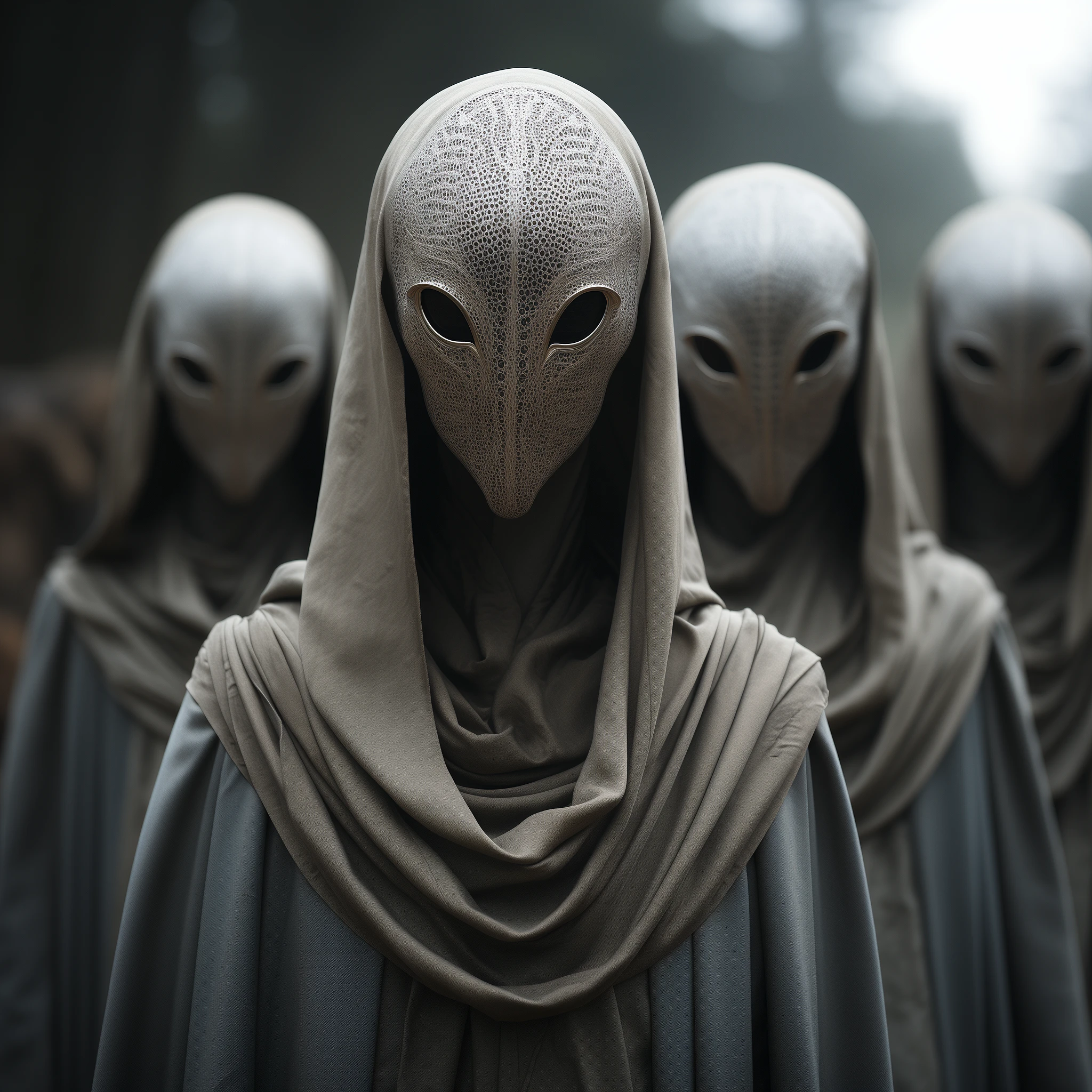 Other Worldly Beings in other worldly and unsettling uniforms, brooding facial features, unsettling look, eerie