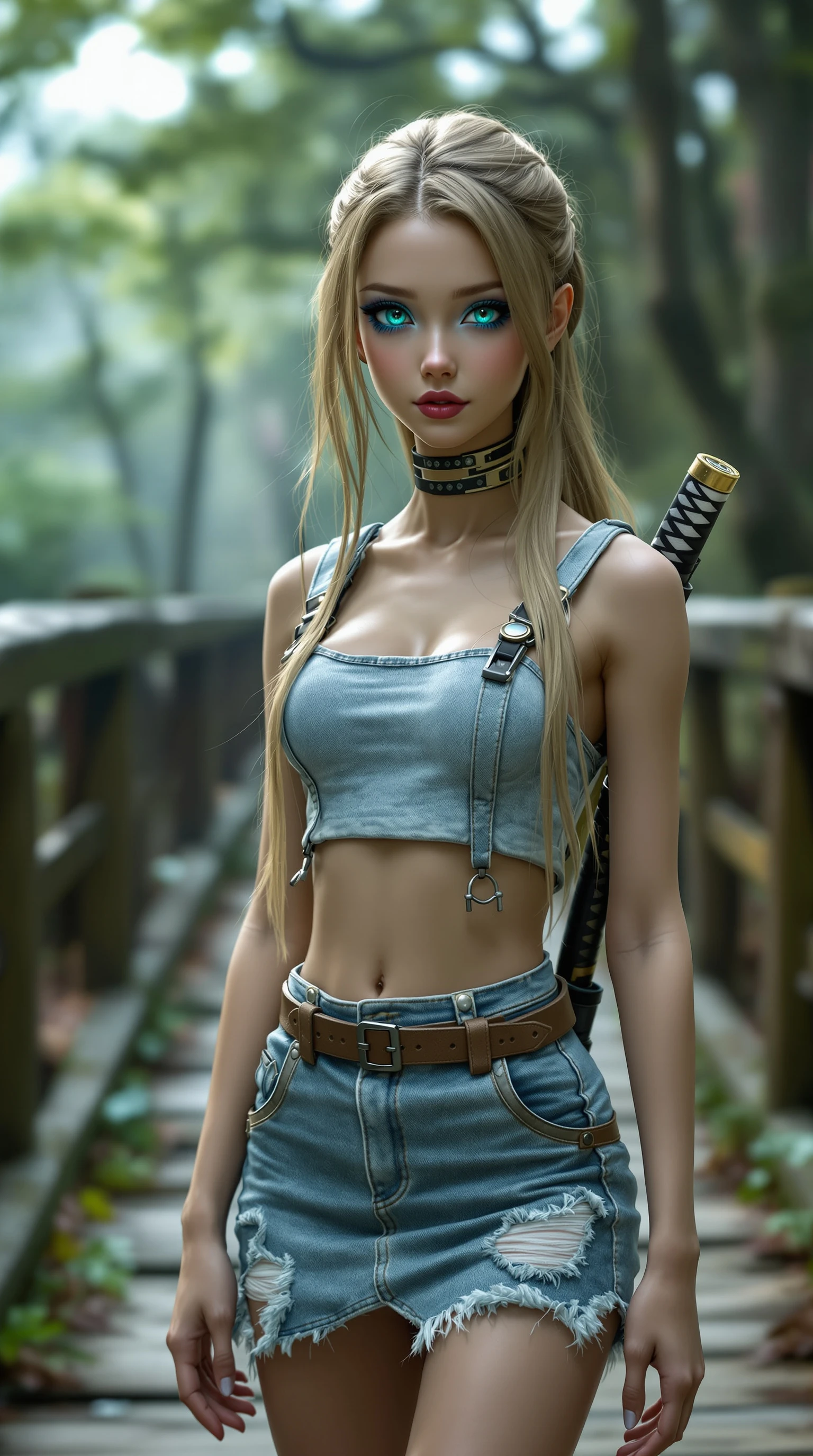 A professional photo depicting the world’s most beautiful sixth-grade girl as a prototype android with incredibly detailed, futuristic, and masterpiece-level realism. The photo captures her perfect anatomy, befitting her age, with extremely long dark caramel blonde hair, flawless olive green skin, and thick blue eyeliner. Her look is further accentuated by extra-long lashes, light pink blush, subtle apple-toned lipstick, and perfectly sculpted lips with blue eyeshadow. Her large, brightly detailed eyes display a striking blend of jungle tea red, green, blue, silver, brown, gold, and gray. She is dressed in a style reminiscent of Into the Badlands, with a high depth of field and a gentle expression as she stands on an old wooden bridge surrounded by a forest, a katana strapped to her back. Wearing a mini suspender crop top and a ripped denim skirt underneath, her legs are beautifully shaped. This high-resolution photo, rendered using Unreal Engine 5 and Octane Render, features intricate detail and ultra-sharp focus. The image is of the highest quality, 8K resolution, ultra-detailed and photorealistic, presented in a frontal, full-body view, with stunning volumetric lighting and excellent graphics. Technical parameters are: Steps: 20, Sampler: Euler, Program type: Simple, CFG scale: 1, Pure CFG scale: 3. 5, Seed: 2496298376, Size: 896x1152, Model hash: d3532ec6fd, Model: flux1DevV1V2Flux1_flux1DevBNBNF4V2, with specified Lora hash values ​​and version details. Negative notices exclude low resolution, text, errors, low quality, and various anatomical and artistic imperfections to ensure a flawless final image.