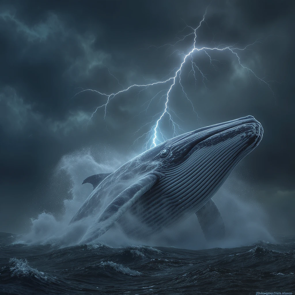 A colossal blue whale, surfacing in the midst of a stormy, tempestuous ocean. Dramatic lightning forks across a dark sky, illuminating the whale's immense form against towering waves. The scene is one of epic power and dramatic scale. Hyper-detailed, photorealistic, cinematic lighting, intense atmosphere. Signature: JDHampton + AI | Creative Alliance --ar 16:9 --style raw