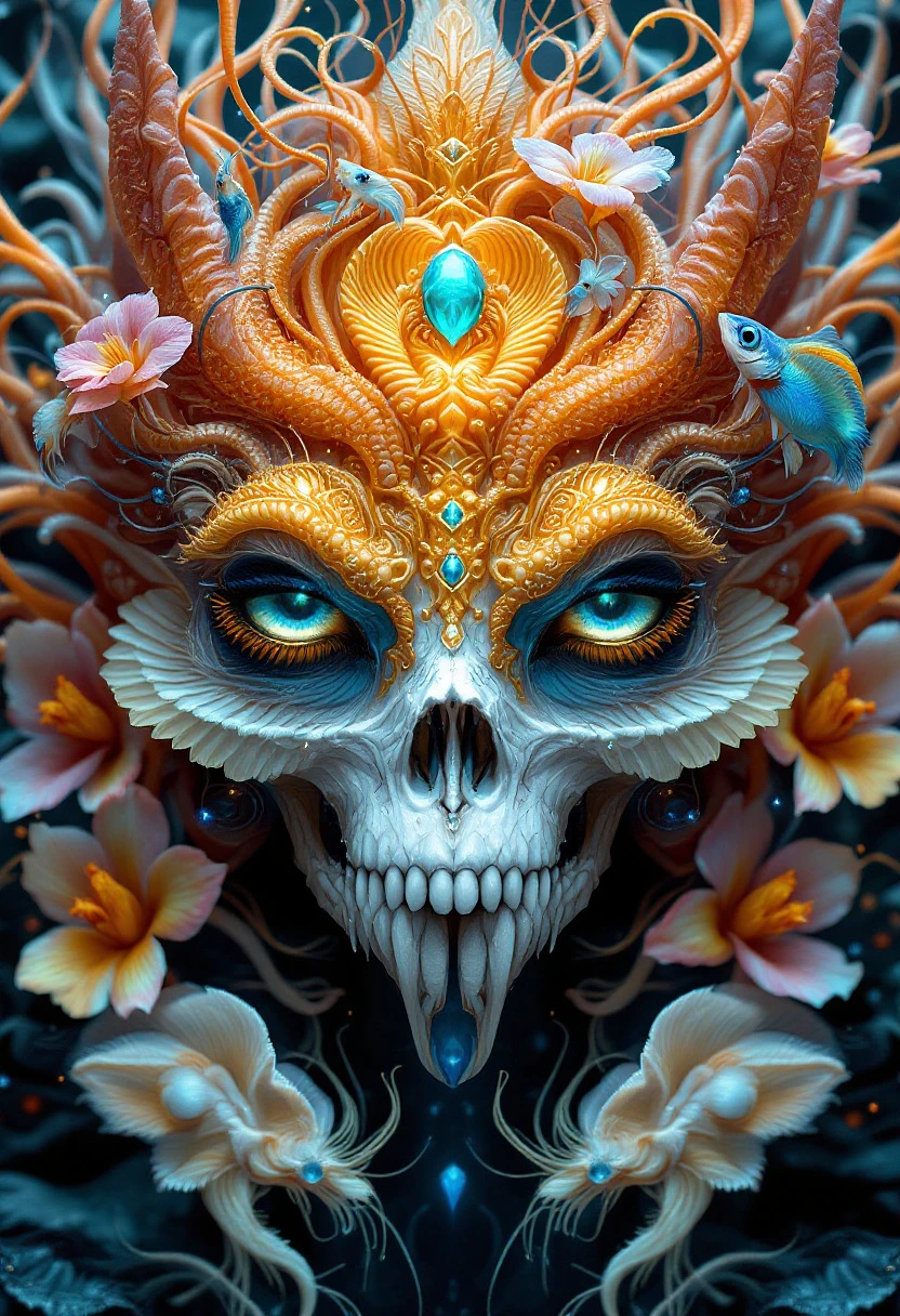 Goddess close-up portrait ribcagel. jellyfish phoenix head, nautilus, orchid, skull, betta fish, bioluminiscent creatures, intricate artwork . octane render, trending on artstation, t symmetrical artwork. cinematic, hyper realism, high detail, octane render, 8k