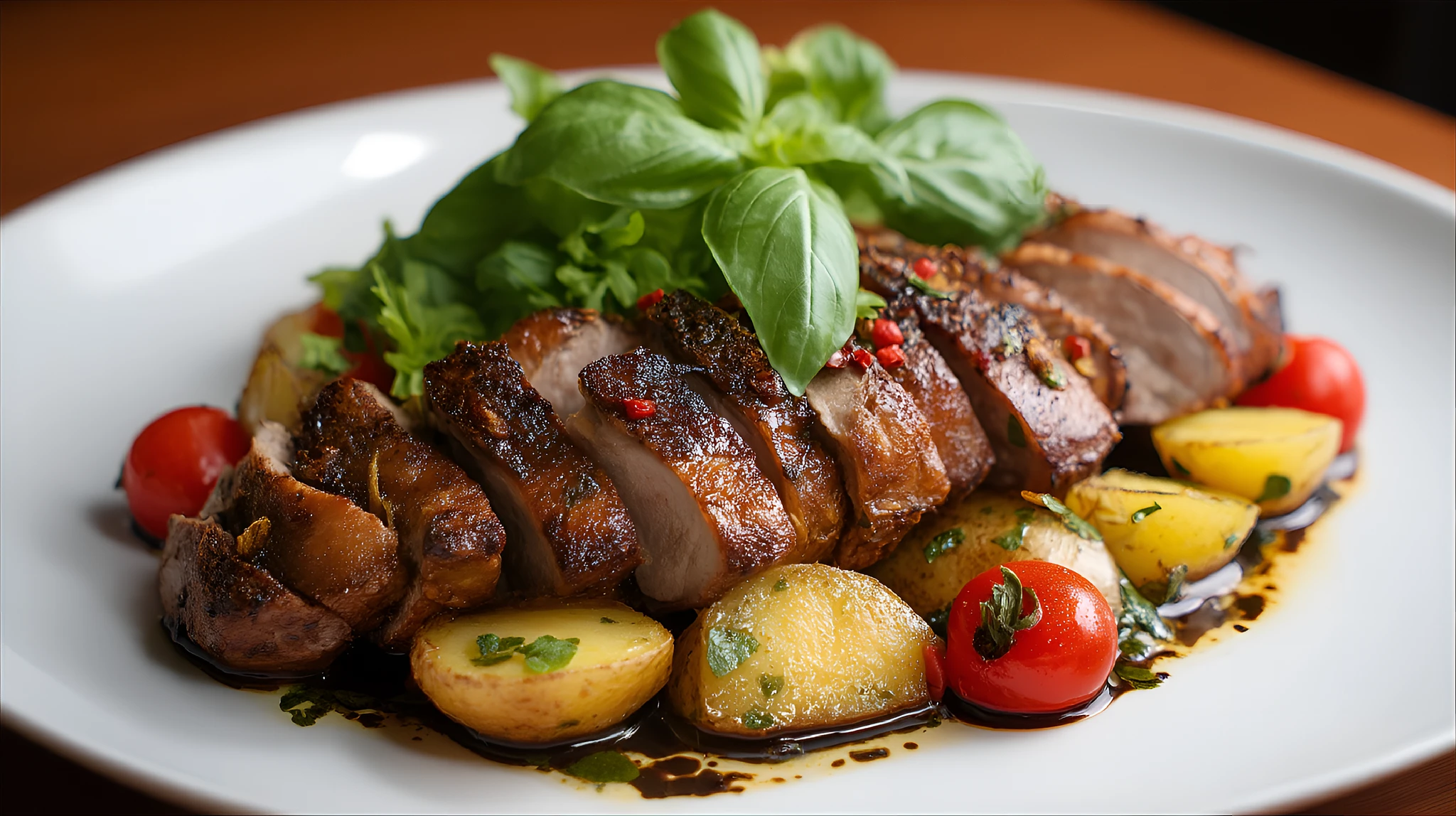 plate of sliced roasted meat, garnished with roasted potatoes, cherry tomatoes, and fresh green lettuce and basil leaves. The meat is a dark brown, with visible grill marks and a crispy texture. The potatoes are a light golden yellow, and the tomatoes are a vibrant red