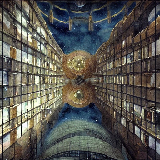 staring up into the infinite celestial library, endless books, flying books, starry, sublime, cinematic lighting, watercolor, mc escher, dark souls, bloodborne, matte painting --ar 9:21 --test