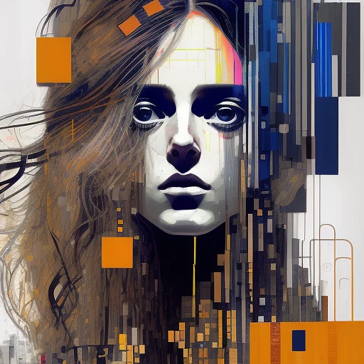 portrait of a determined woman with long hair, gritty, digital ui, abstract blocks, by Gustav Klimt, Guy Denning, Russ Mills, chromatic, color blocking! , octane, object centered, oil on canvas, symmetrical, concept art, abstract, trending on artstation, trippy, bar code art high texture, --c 100 --s 1000 --ar 3:4 --style raw --q 2 --s 750