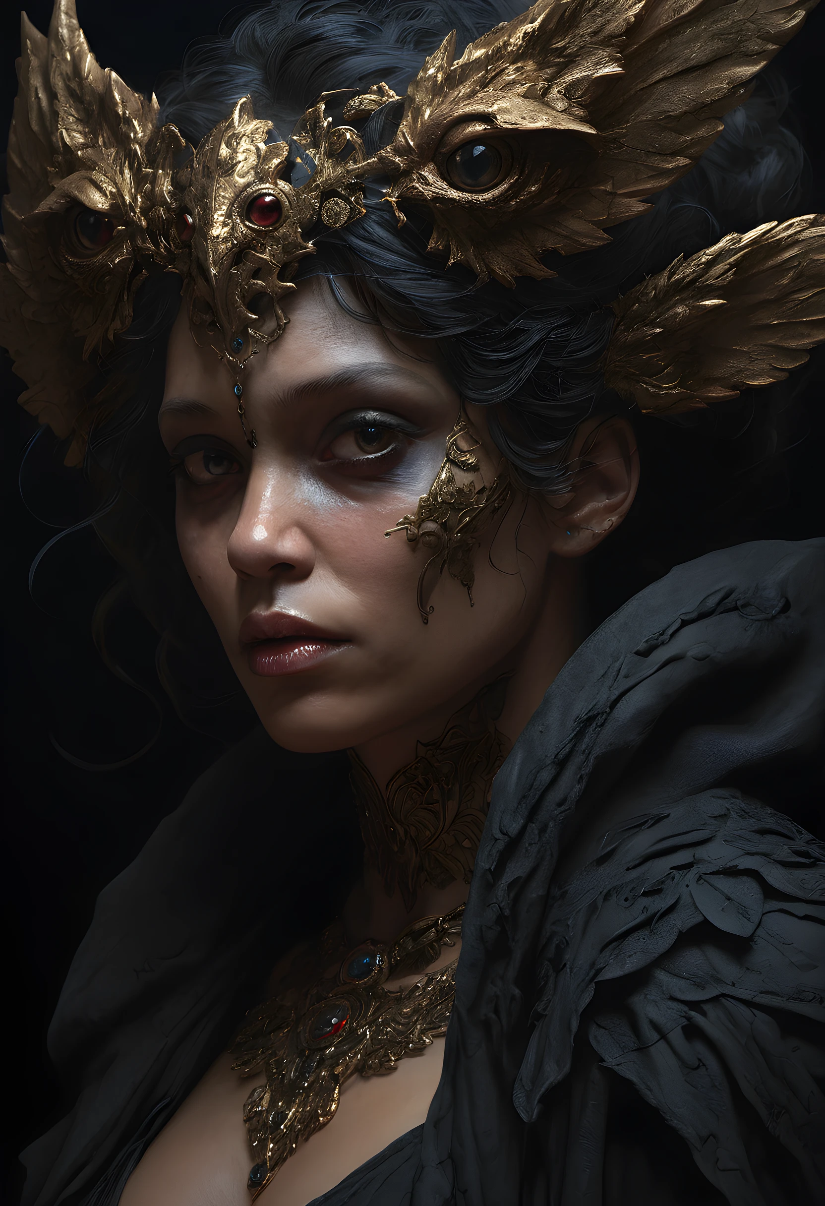 Dark portrait of a mysterious creature woman, cinematic lighting, dramatic shadows, intense gaze, digital painting, art book cover, artstation, concept art, highly detailed, intricate, photorealistic, chiaroscuro, dark and moody, dramatic lighting, gothic, art by greg rutkowski and alphonse mucha