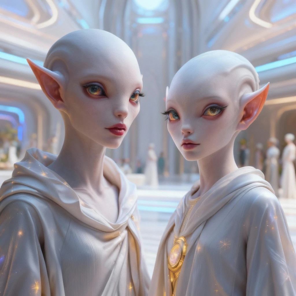 Give emotional depth. Give background, clothing, and pose to emphasize sleek comfort with a futuristic society of elegance. Give the character Large, beautiful Eyes, full lips, and a jawline. Create a full body image of the character. Maintain Ultra-realistic realism with subtle otherworldly grace — intelligent, regal, visually harmonious, innocent, and beautiful