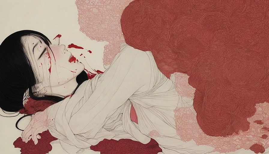a woman crying blood, artwork by Takato Yamamoto and Chika Yamada, very detailed, minimalistic