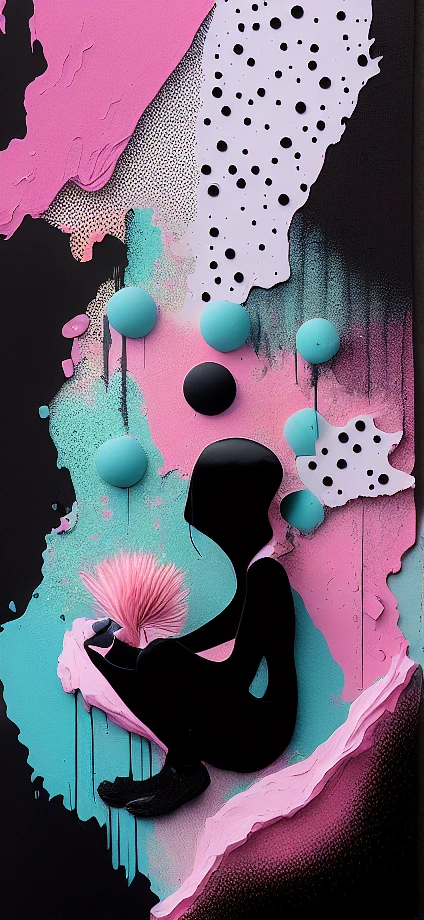 3d matte render, totally crazy LET'S GO, pastel colors, hyper-realism, pastel, polkadots, minimal, simplistic, amazing composition, woman, vaporwave, wow, Gertrude Abercrombie, Beeple, minimalistic graffiti masterpiece, minimalism, 3d abstract render overlayed, black background, psychedelic therapy, trending on ArtStation, ink splatters, pen lines, incredible detail, creative, positive energy, happy, unique, negative space, pure imagination painted by artgerm