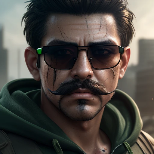 Photo of a ultra realistic, cinematic lighting, 4k, hyper realistic, focused, extreme details, post-apocalyptic, Short, Hispanic, brown eyes, short black hair, mustache stubble, detailed face, Scarred right cheek, Sunglasses, Green hoodie,