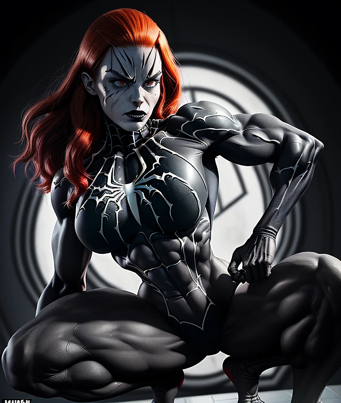 1 bodybuilder woman with a wide jaw wearing black lipstick, Mary=Jane=Watson wearing her black Spider-Man venom symbiote, muscular, red hair, clean face, feminine face, feet visible, big arms, big legs, crouching, back towards viewer,