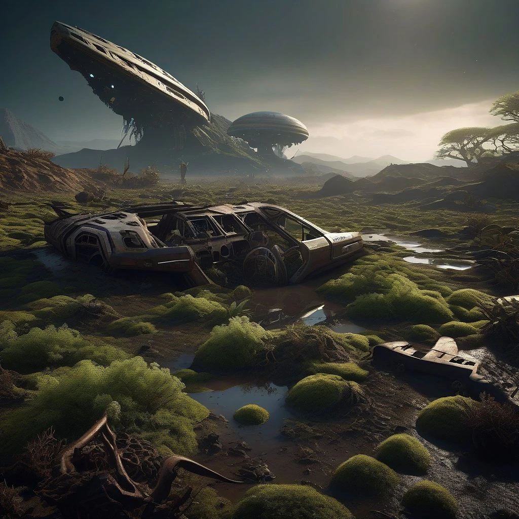 highly detailed wreckage of mile-long ancient [horseshoe:spaceship:0.2] crash landed on alien planet a long time ago, hull ripped apart, partly embedded in ground, tiny alien humanoidcreatures in mid foreground, mossy strands, rotting vegetation, marshy ground, reflections, gritty, dirty lighting, dark, moody, misty, cold, UHD