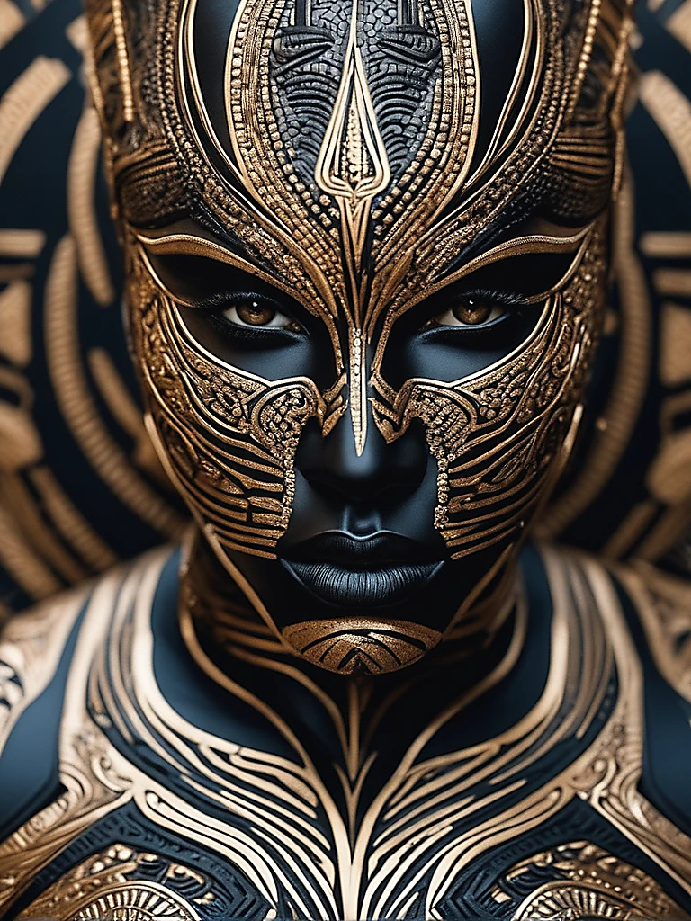 intricate closeup-shot, masterpiece artwork, latin skin-tight body, tribal suit, black accent