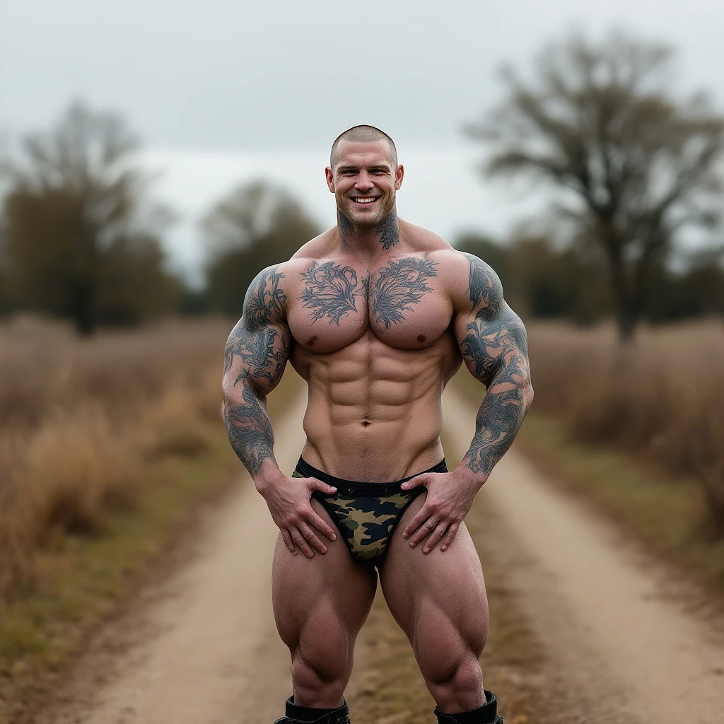 Full body image, tall fit slim white irish bodybuilder, heavily tattooed, slim face, chiseled jawline, shaved head, big dick in camouflage print thong underwear, big feet in black combat boots, big smile, standing outside on dirt road
