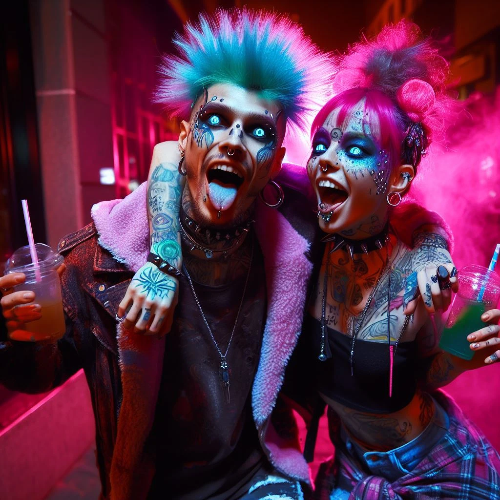 Deux amies punk rock s'amusent dans la rue, profitant de la nuit animée. Elles se tiennent par la taille, complices et joyeuses. Leur style est audacieux et coloré, avec des cheveux extravagants, des piercings, des tatouages et des vêtements originaux. Elles portent des boissons à la main et sont entourées d'un nuage de fumée. L'éclairage néon crée une ambiance festive et cinématographique. Leur visage est dessiné avec un réalisme saisissant, dans un style anime. Leurs yeux brillent de couleurs bioluminescentes.
