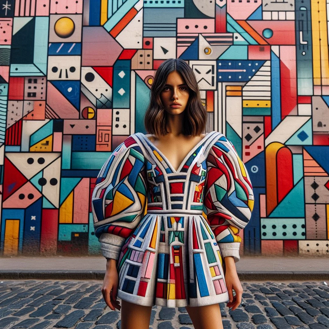 A 90s street photographer in Santiago portraits a confident model in front of abstract graffiti made only with straight and colorful shapes. The dress creates an amazing blend in color and form, intricate details, tokyo fashion week.