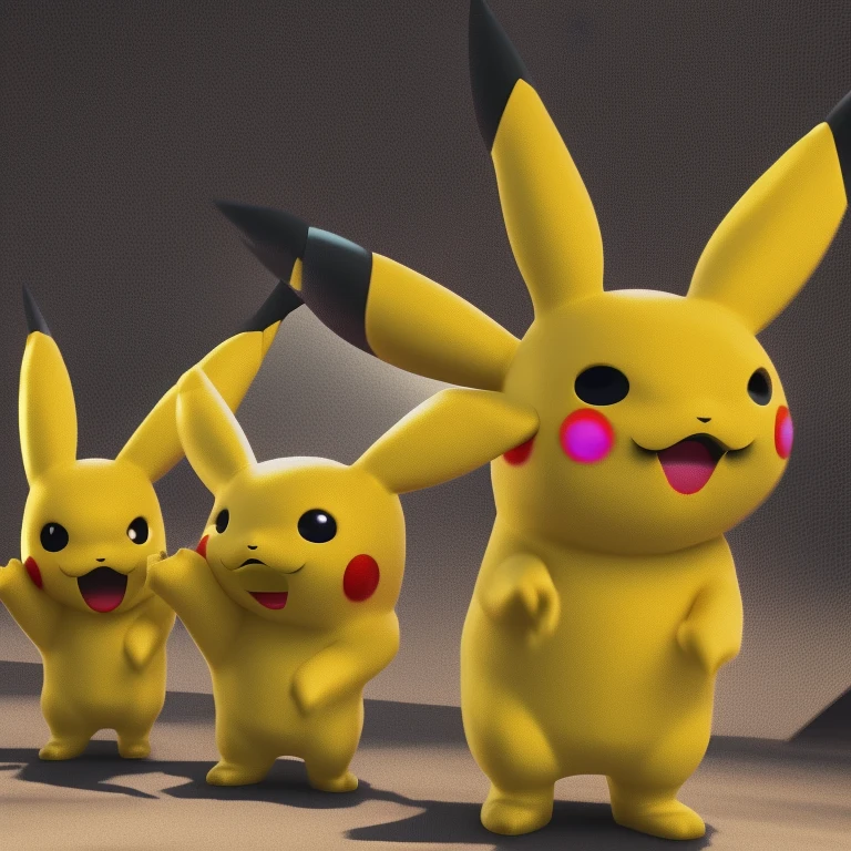 three Pikachu facing viewers, one Pikachu is robotic, second Pikachu is made with bubble gum and third Pikachu as ghost, going for war, scan like Hollywood horror movie style. Hyper realistic, hyper details, hyper cinematic, 8k UHD, unreal engine, 5D, hyper render.