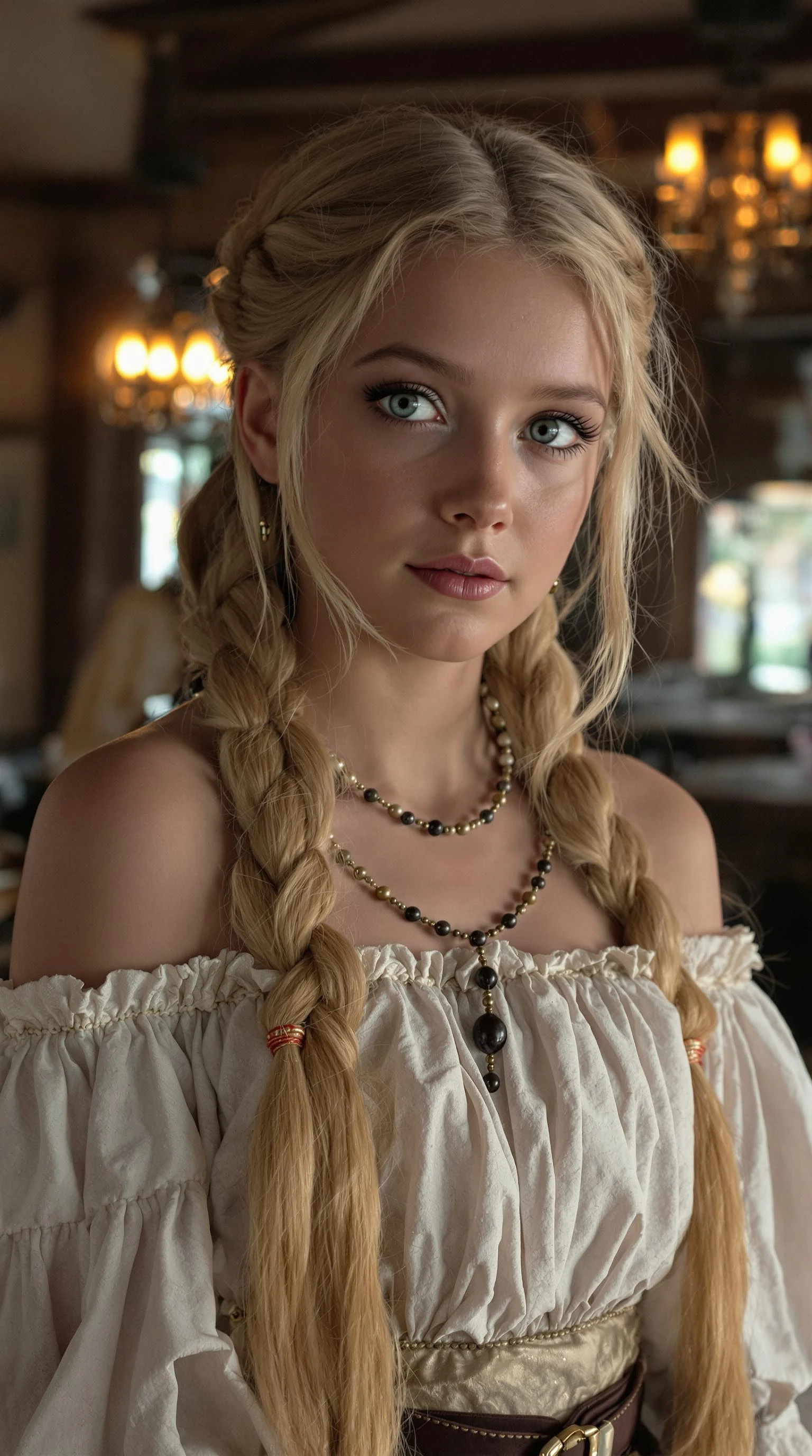 a professional photo of a exceptionally of the most beautiful (age 11) during the American frontier early 17th century, (futuristic) , (masterpiece) , (realistic) , (perfect anatomy) , (Full body viewing from head to feet) , with extremely long Dark Champagne Blonde hair in a braid, with beads, large beautiful brilliant Forest Tea red-green-blue-silver-brown-golden-grey eyes, flawless skin, (dressed in the style off the shoulder of a girl in The American frontier early 17th century ) (standing in a saloon of the early 17th century) 8k, (high res) , ultra-detailed, photo-realistic, full image view, full body view, front view, highly detailed, volumetric, dramatic lighting
