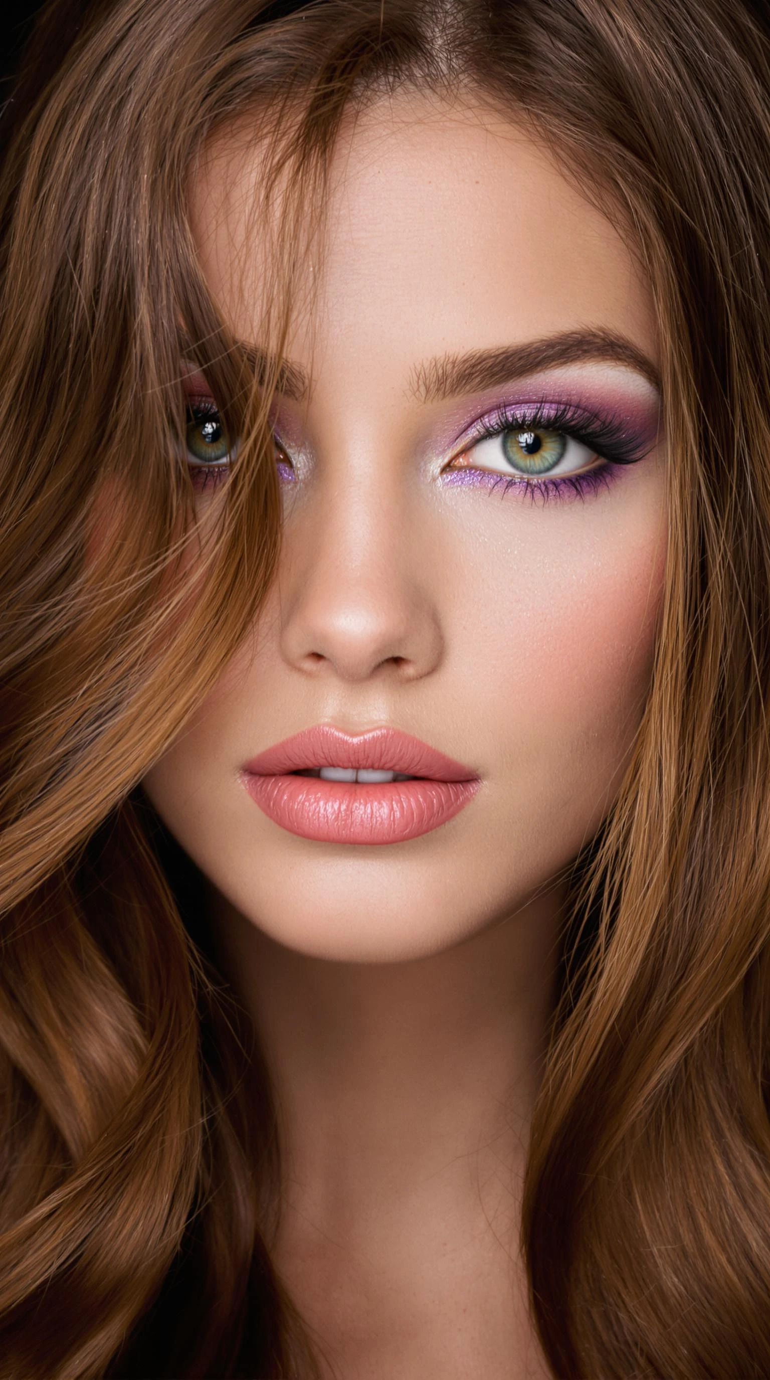 "The image is a striking close-up portrait of a woman with lustrous, chestnut brown hair cascading like a silken waterfall over her slender shoulders. Her alabaster skin radiates a gentle luminescence, enhancing her ethereal beauty. Large, soulful emerald green eyes, framed by meticulously sculpted eyebrows, and adorned with a shimmering amethyst eyeshadow, adding a touch of mystique. Her lips, full and inviting, are painted in a delicate rose hue, subtly completing her enchanting allure. The background is a rich, velvet black, which adds depth and drama to the composition, allowing her features to stand out in mesmerising focus. "