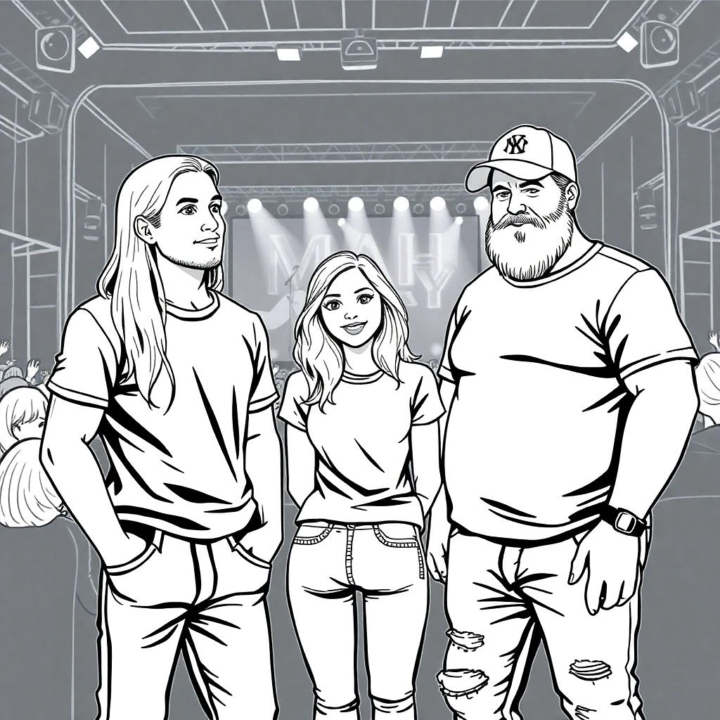 Composition: (2 men, 1 woman) Three friends at a Mariah Carey concert watching her perform live on stage from in the crowd. Concert lights, speakers, stage and mariah carey visible. The woman stands in the middle of the two men. The first man: wearing a tshirt and jeans. Long, hair passed his shoulders, underside shaved. Medium-muscled physique Short, neatly trimmed beard. Large, piercing blue eyes. The second man: Wearing a baseball cap, tshirt and jeans. Quite tall with a cuddly and slightly chubby physique. Short, well groomed beard. The woman: Wearing a tshirt and ripped jeans. Wavy, mid-length hair. Large, expressive brown eyes. Shorter than both men. Black and white. Simple. Line art. Detailed sketch. Colouring in page.
