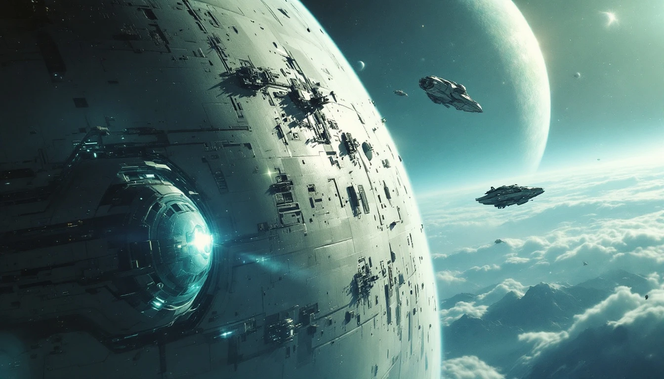 Cinematic still of a space station orbiting an alien planet, with a large white spaceship in the background and small spacecraft floating nearby. The style is reminiscent of 1970s science fiction fantasy art, with a retrofuturistic, dark and gritty space opera aesthetic, and retro-futuristic technology depicted in a hyper-realistic manner. --ar 128:89 --s 250 --style raw --v 6. 1