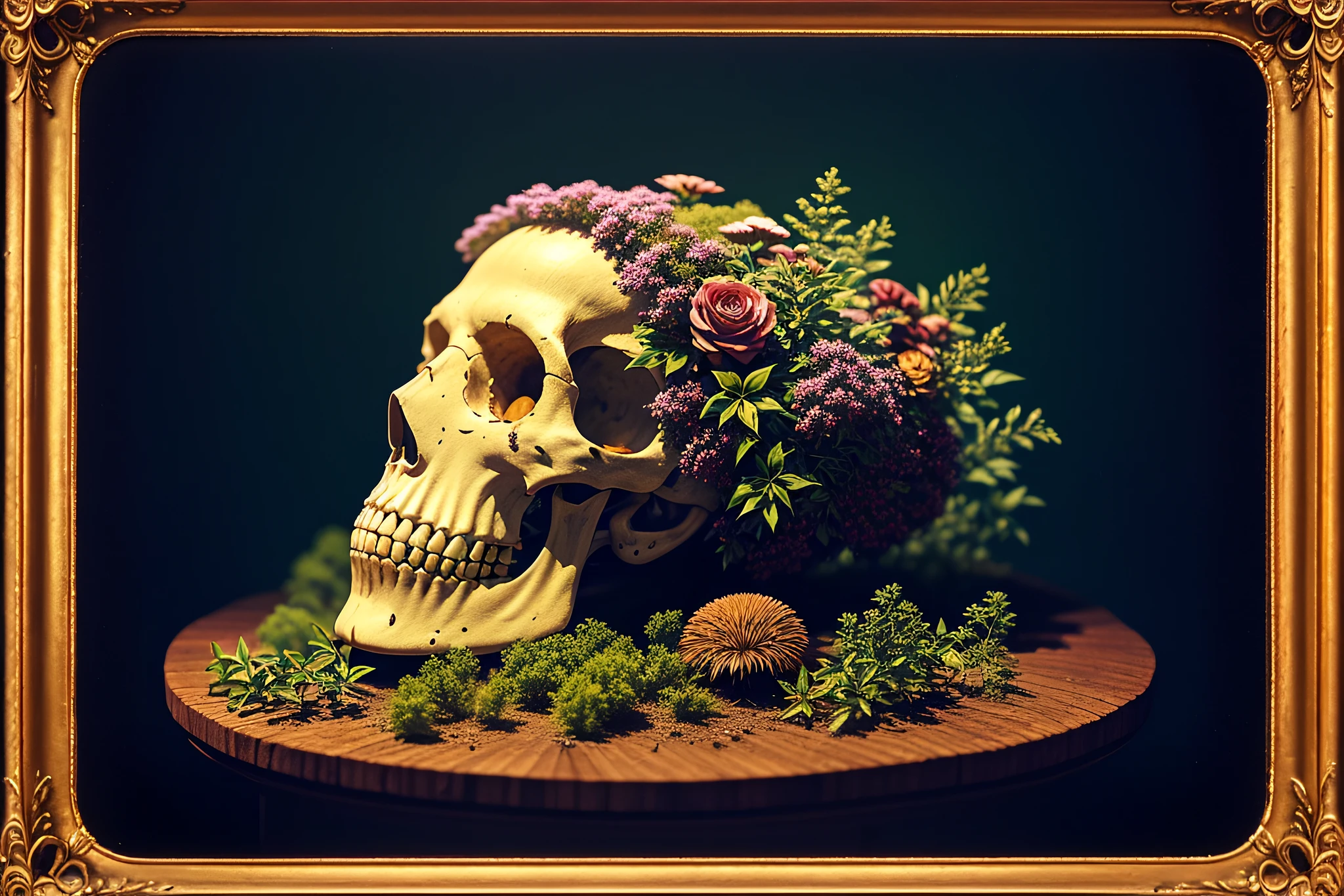 a beautiful detailed front view rococo portrait of a rotten woman corpse becoming almost a skull with fractal plants and fractal flowers and mushrooms growing around, intricate, ornate, volumetric light, beautiful lit, polaroid photography, the northman, 8k, UHD, HDR, (Masterpiece:1.5) , (best quality:1.5)