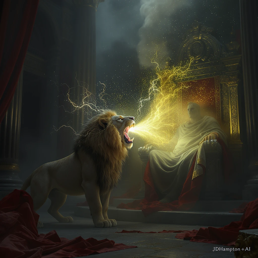 A surreal and haunting dream vision. A majestic Barbary lion, stands in a misty, empty Roman throne room. Its face is locked in a fierce snarl, roaring a silent, powerful warning. Directly before it, the figure of a crooked Roman Emperor known as Nero, his sits on his golden throne. The lion's roar is a visible, shimmering wave of energy that makes the emperor's shadowy form flicker and recoil. Symbolic, cinematic, dark fantasy art, style of Greg Rutkowski, dramatic lighting, and an atmosphere of divine judgment. The scene is epic, serene, and majestic, showcasing the lion as the true ruler of this rugged landscape. Photorealistic, National Geographic style, dramatic natural lighting, hyper-detailed. Style of a historical painting, golden hour lighting, evocative and solemn. Signature: JDHampton + AI | Creative Alliance