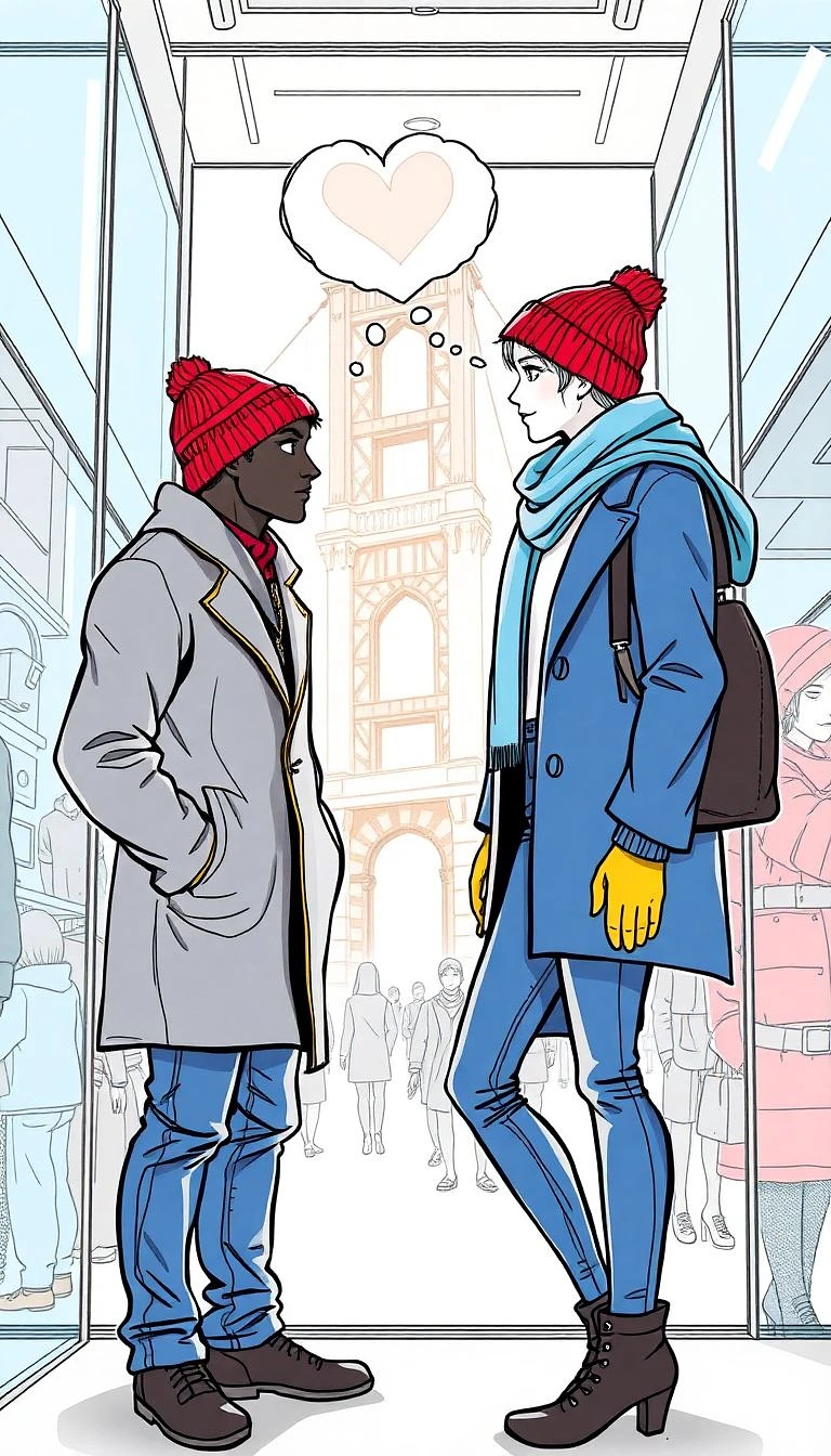 # Comic Book Love Story: "A Dream in Disguise" - Panel Prompts ## Common Elements for All Panels: Story Summary: A love story between Victor (black male mannequin) and Viola (white female mannequin) in a NYC department store. Both drawn in A-ha "Take on Me" pencil sketch style against hyperrealistic colored backgrounds. Setting: Busy New York department store with Brooklyn Bridge visible through windows, sunny winter morning. Outfits: Both wear H&M winter clothes - Victor in blue jeans and grey long coat with golden zipper; Viola in tight blue jeans, black belt and loosely opened blue coat. Both have red beanies, blue scarves, and warm yellow gloves. ## Panel 1: A pencil-sketch black male mannequin (Victor) and white female mannequin (Viola) standing apart in a hyperrealistic colored busy department store. Brooklyn Bridge visible through windows. Victor gazes at Viola with a heart-shaped thought bubble above his head. Morning sunlight streams through windows. A-ha "Take on Me" sketch style for mannequins only. No text, only emotions through thought bubbles. ## Panel 2: Close-up of Victor's face in A-ha pencil sketch style, wearing red beanie and blue scarf. Intense gaze toward Viola (slightly blurred in foreground) . Hyperrealistic colored Brooklyn Bridge visible through windows. Thought bubble above Victor contains multiple hearts and Cupid's arrows. Winter sunlight casting dramatic shadows. No text. ## Panel 3: Victor in pencil sketch style at colorful flower vendor, selecting a single red rose. Still in winter H&M outfit. Hyperrealistic colored busy NYC department store background. Brooklyn Bridge visible. Thought bubble shows question mark. Colored shoppers rushing past contrast with sketch-style Victor. Warm sunlight effect. No text. ## Panel 4: Victor walking purposefully through department store displays, holding red rose. A-ha pencil sketch style. Hyperrealistic colored background. Brooklyn Bridge through windows. Thought bubble shows stick figure running. Victor's determined expression contrasts with busy store environment. Strong directional lighting. No text. ## Panel 5: Victor and Viola face-to-face in pencil sketch style. Hyperrealistic colored NYC department store background with Brooklyn Bridge. Victor holding rose toward Viola who leans toward him. Thought bubble above Victor shows surprised emoji. Winter light creates dramatic atmosphere. No text. ## Panel 6: Victor and Viola embracing in kiss, pencil sketch style with glowing aura. Hyperrealistic colored Brooklyn Bridge background. Still in winter H&M outfits. Two connected red hearts floating above them. Sunbeams highlighting their embrace. Magical atmosphere. No text, pure emotion.