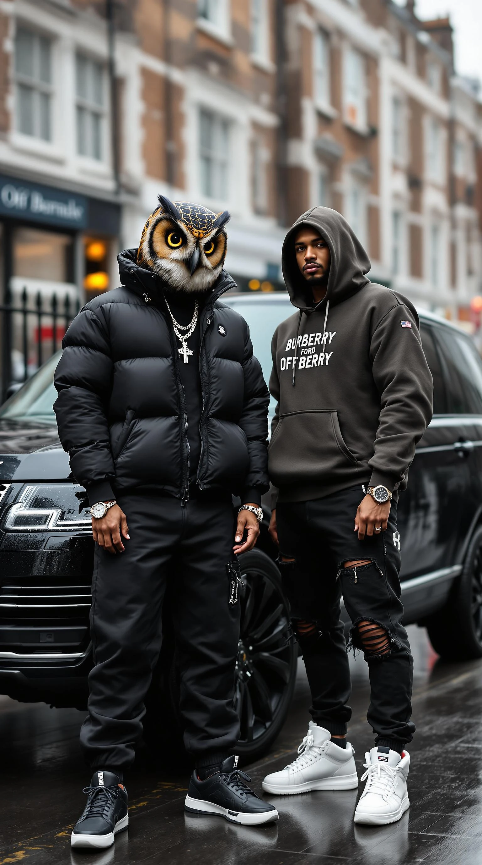 Two men with a UK drill-inspired luxury street look, blending roadman vibes with millionaire energy. The Owl-headed man wears a Moncler puffer jacket over a black Stone Island tracksuit, accessorized with Cuban link chains and a Richard Mille watch. His partner flexes a Burberry hoodie with distressed designer jeans and Off-White sneakers. They stand next to a blacked-out Range Rover in the rainy streets of London, exuding power