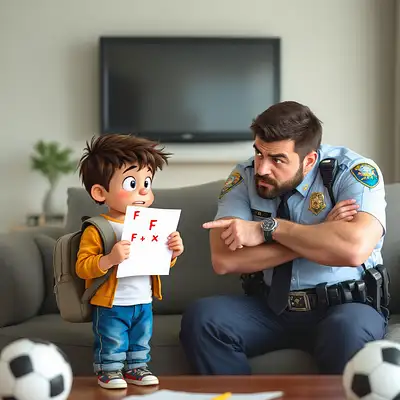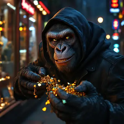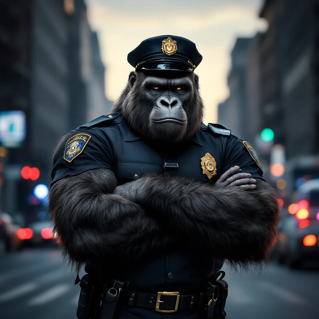 A hyper-realistic image of a strong and muscular gorilla dressed as a police officer. The gorilla has deep brown fur, sharp focused eyes, and a stern yet noble expression. He wears a well-fitted dark blue police uniform with a golden badge on the chest, a black utility belt with handcuffs, and a police radio. His navy blue police hat sits firmly on his head. He stands confidently in a bustling city street at dusk, with red and blue police sirens flashing in the background. His massive arms are crossed, exuding authority, while his eyes scan the surroundings for crime. The texture of his fur is highly detailed, with individual hairs visible, and the lighting creates a dramatic cinematic effect.