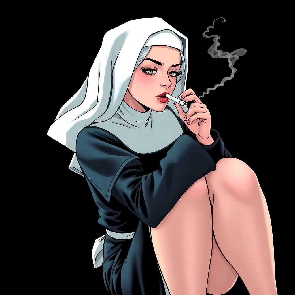 Comic book cover illustration, full body shot of a white-haired nun, smoking, knees up, apathetic on dark background, from above, perspective, detail, epic, comic book cover, hot, cool pose --ar 4:5 --personalize br5db1d --stylize 700 --niji 6