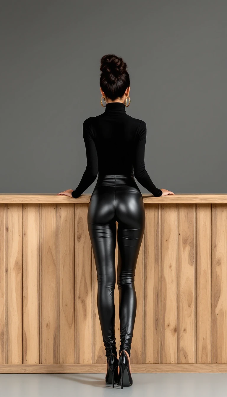 Rear view, photo of a gorgeous brunette woman, Hispanic, high bun dark hair, Gold hoop earrings, standing behind a wooden counter. She is wearing black skin-tight leather pants and black form fitting turtleneck sweater. Black high-heels. Solid grey background. Vivid colors. Photorealistic. UHD.