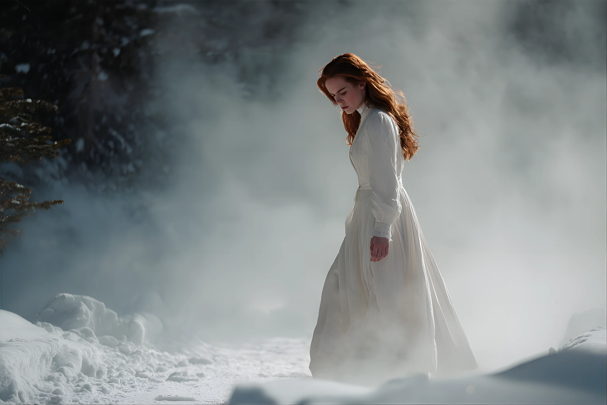 beautiful fiery redhead in a bright white dress melting the snow around her where she walks, angle liek atmosphere