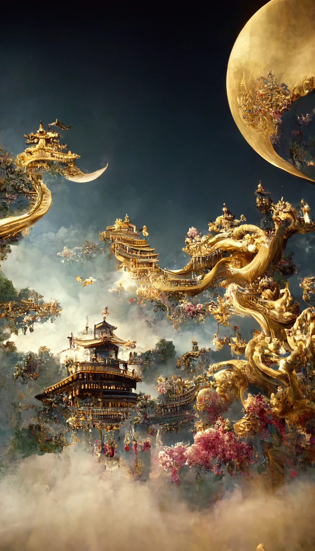 Gorgeous golden Chinese palace, CG rendering Chinese style, overlooking, fairy tales, surrounded by peach blossoms, dragons and phoenixes chasing the moon in the sky, very beautiful, lighting effects, dreams, starry sky, super details, illustrations, 8K unreal engine, ethereal clouds. 8k --ar 9:16