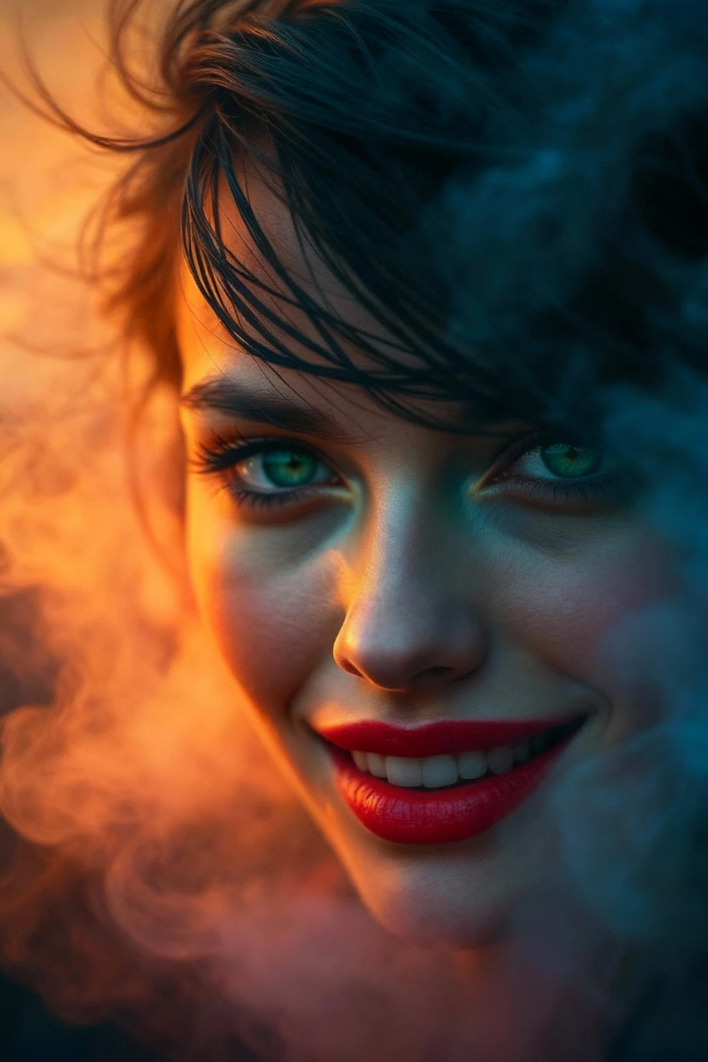 "Fine art photography featuring a supermodels face in close-up, swirling thick mist with vibrant, warm colours, under soft, dark, professional lighting. She has light skin, raven black windswept hair, expressive vivid emerald green eyes, parted red lips, cheeky smile, editorial style. "