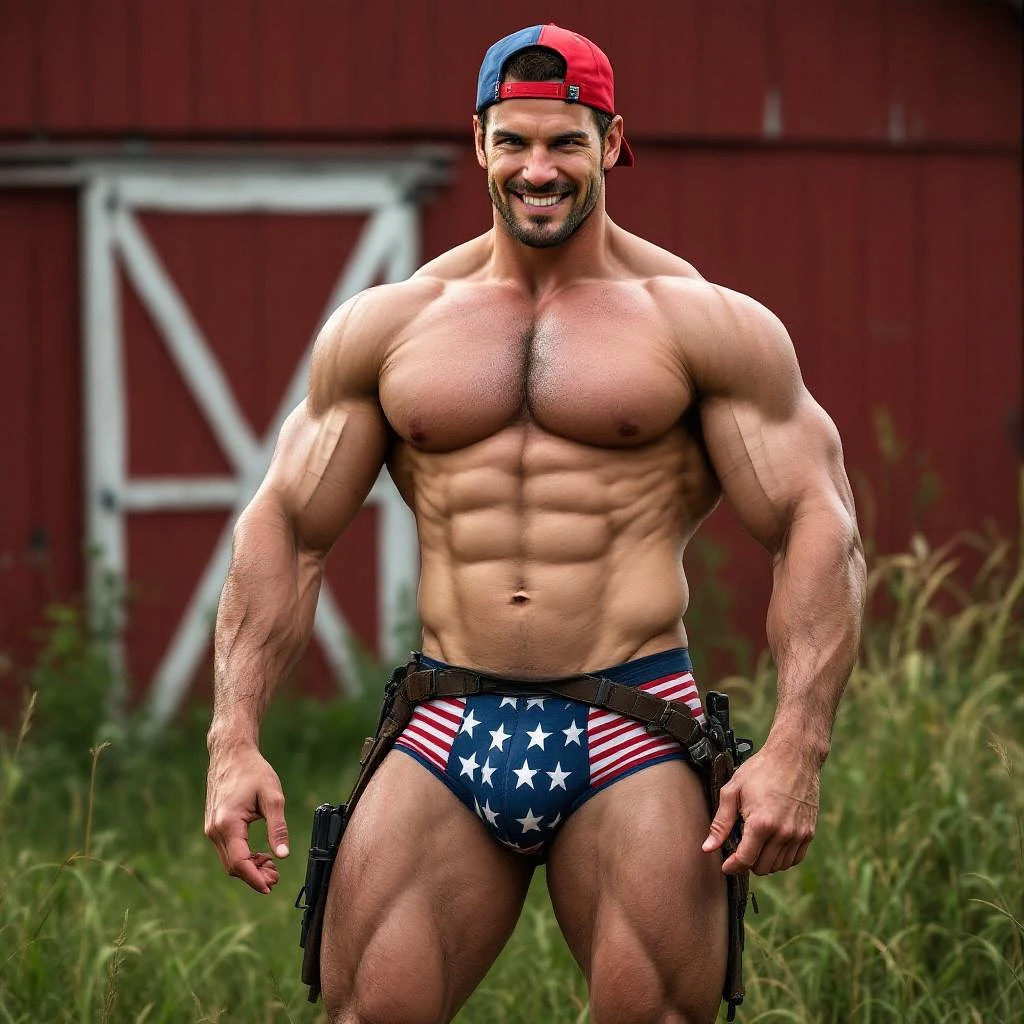 Nathan Drake, Full body image, looking at us, shirtless, muscular abs, big crotch bulge in stars and stripes boxer briefs underwear, red backwards baseball hat, big bare feet, standing in grass by red barn, flexing one bicep, grinning