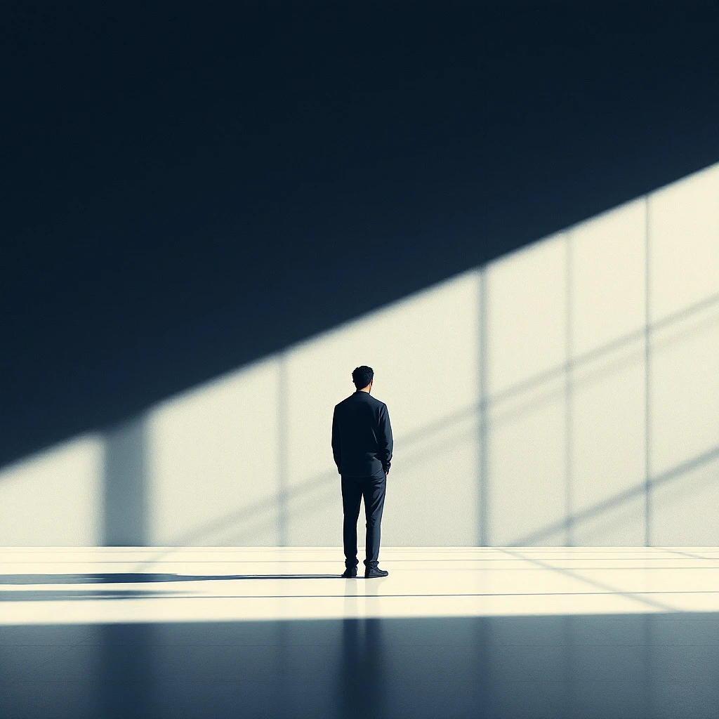 contemporary, minimalist, wide, one subject, centered, digital illustration, wide angle, head-on, low contrast, solitary man in silhouette, mid-thirties, dressed in a simple, modern outfit, his posture relaxed and introspective large, softly lit space with navy and soft white, environment is sparse and open, emphasizing solitude and contemplation, soft gradient from warm tones, creating a tranquil and ethereal atmosphere focus on the subtle interplay of weak light and shadow on the subject and surroundings, focus on texture and ambient light --ar 9:16 --style raw --v 6. 1